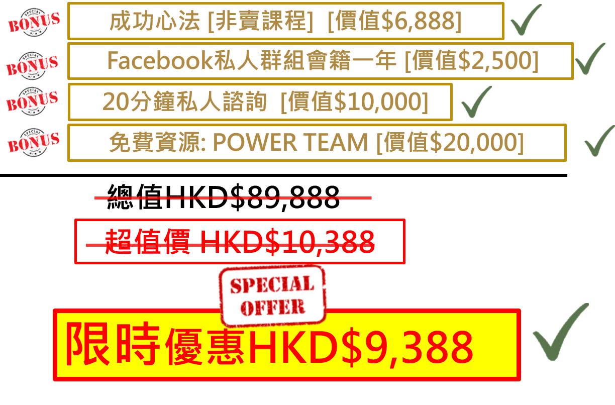 • ​你會知道自己在成功的先決條件中尚欠什麼 ( 可以先告訴你,絕大部份的人欠缺的不是錢)